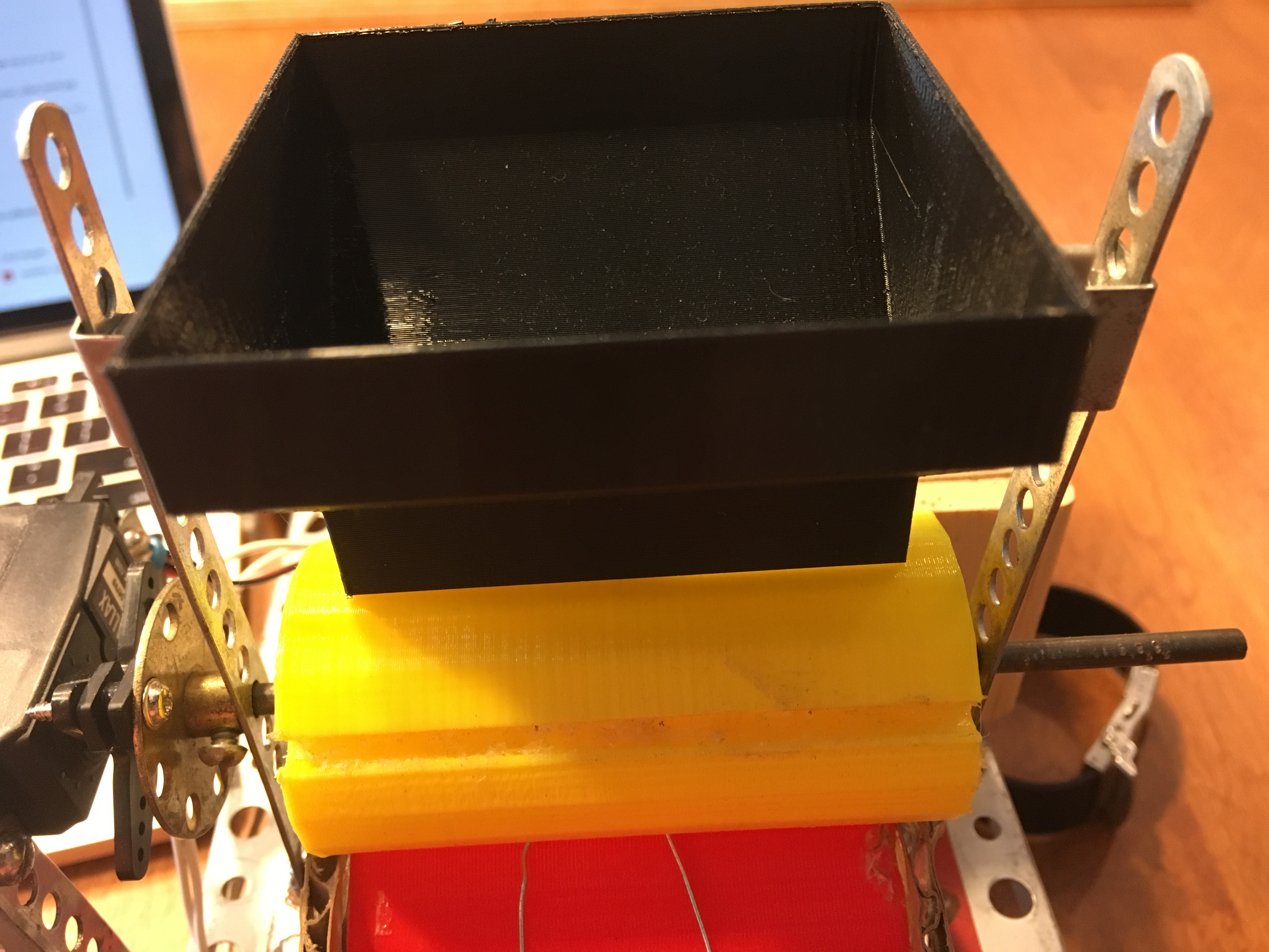 Background: In robotics class (MECE 404) the teacher divided the class into teams of two with the very open ended assignment of: build a robot. My teammate Charlotte and I spent a week brainstorming ideas. After looking around the robotics lab one day we noticed a big bin of unsorted resistors, as many robotics/electronics labs have, and decided to build a robot to sort that bin.