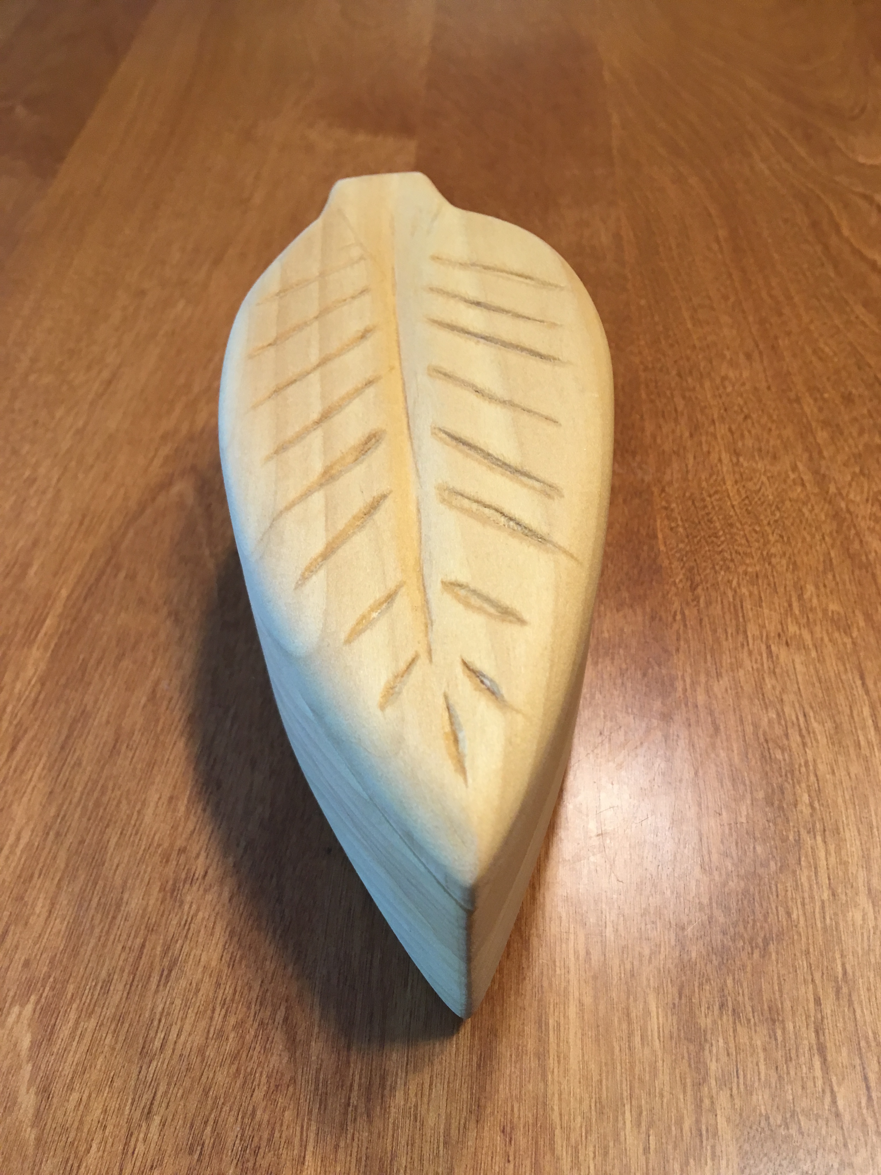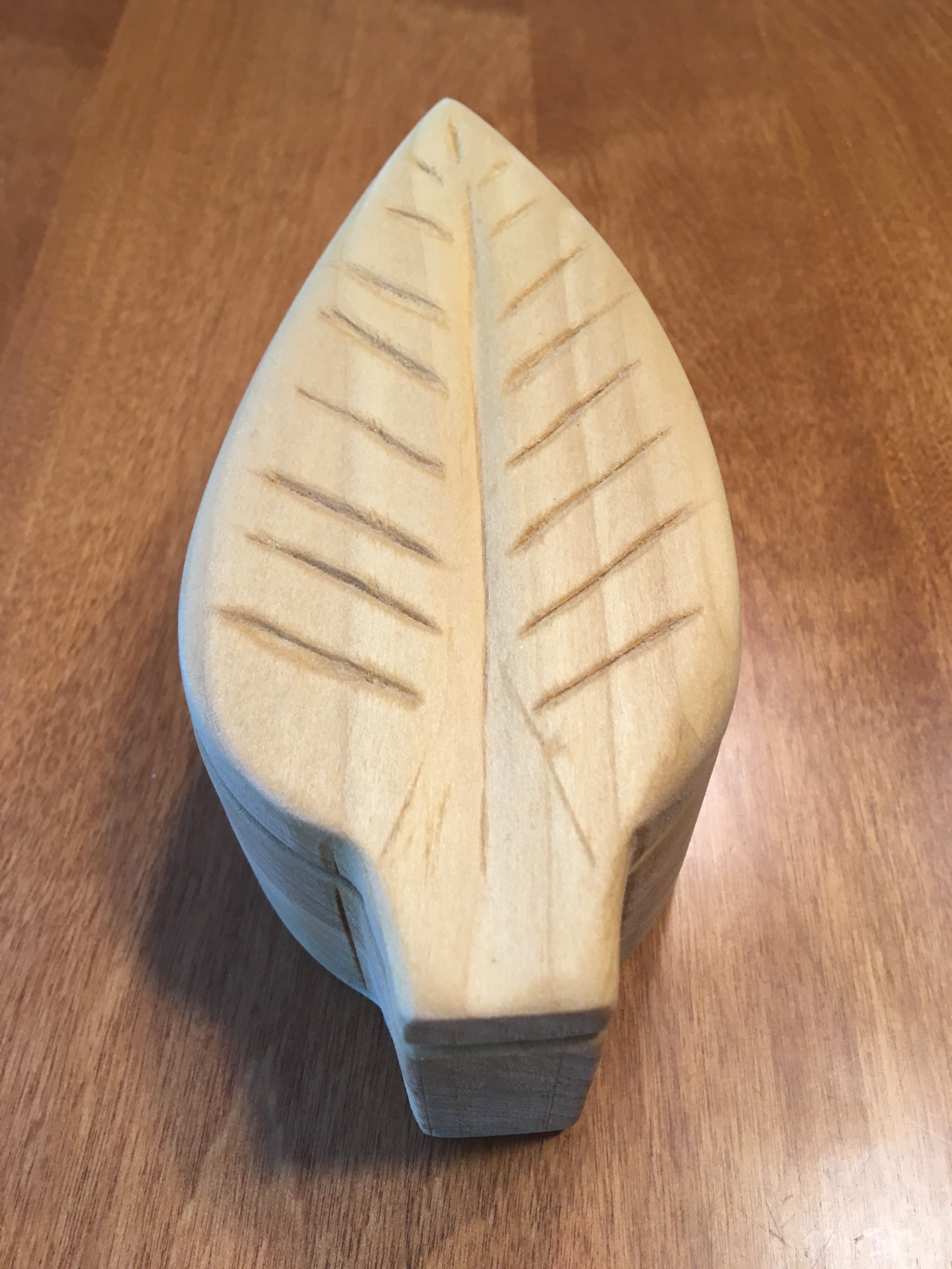 Design: I chose to make a leaf for my piece. I was looking for a simple organic shape. The shape couldn’t have sharp edges or lots of thin sections. Another consideration I had to make was to make sure it was a shape that could easily be made to accommodate storage inside. I settled on a leaf which meet all of these criteria and poplar is naturally a greenish color, which helps make the leaf more realistic.