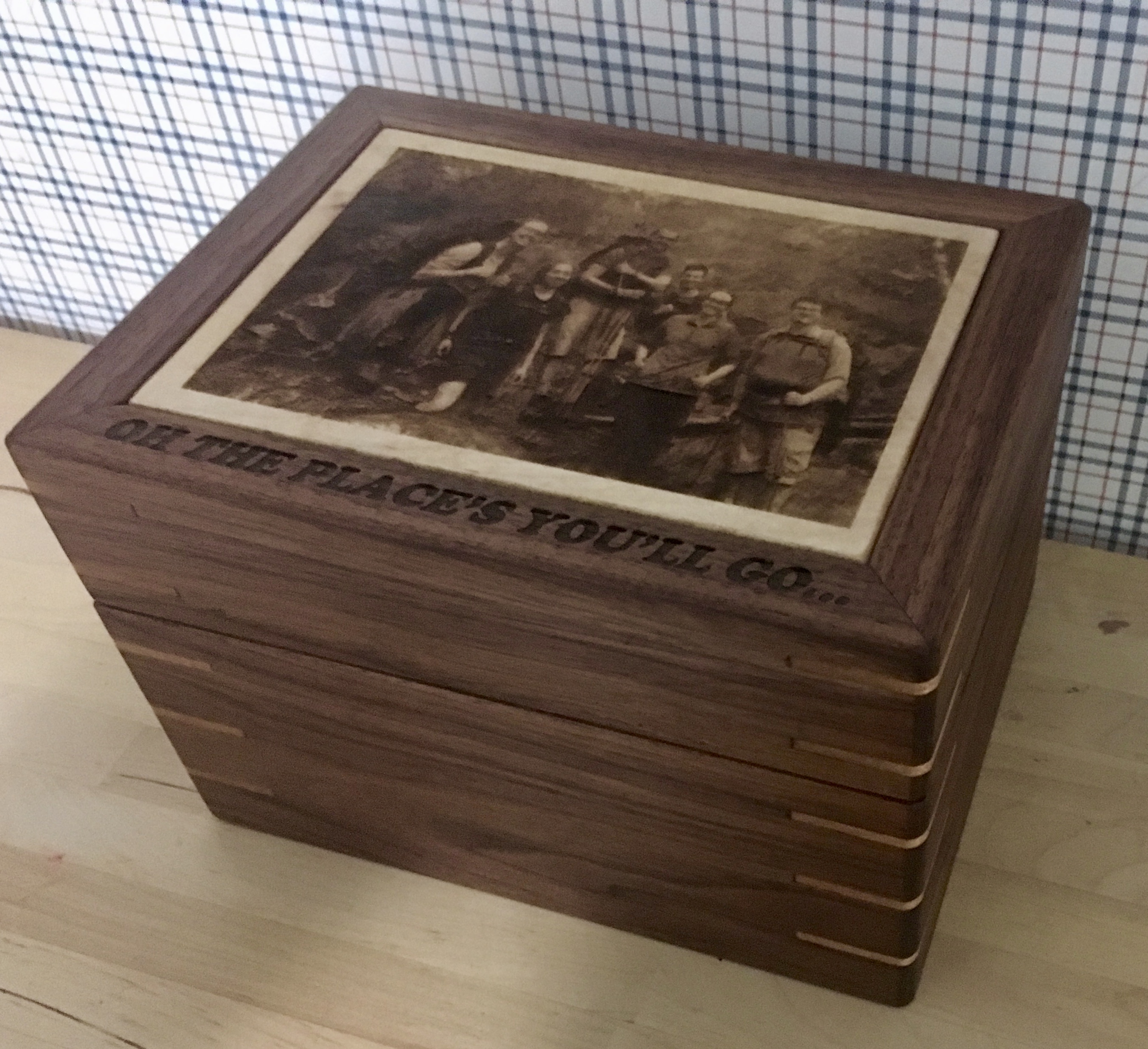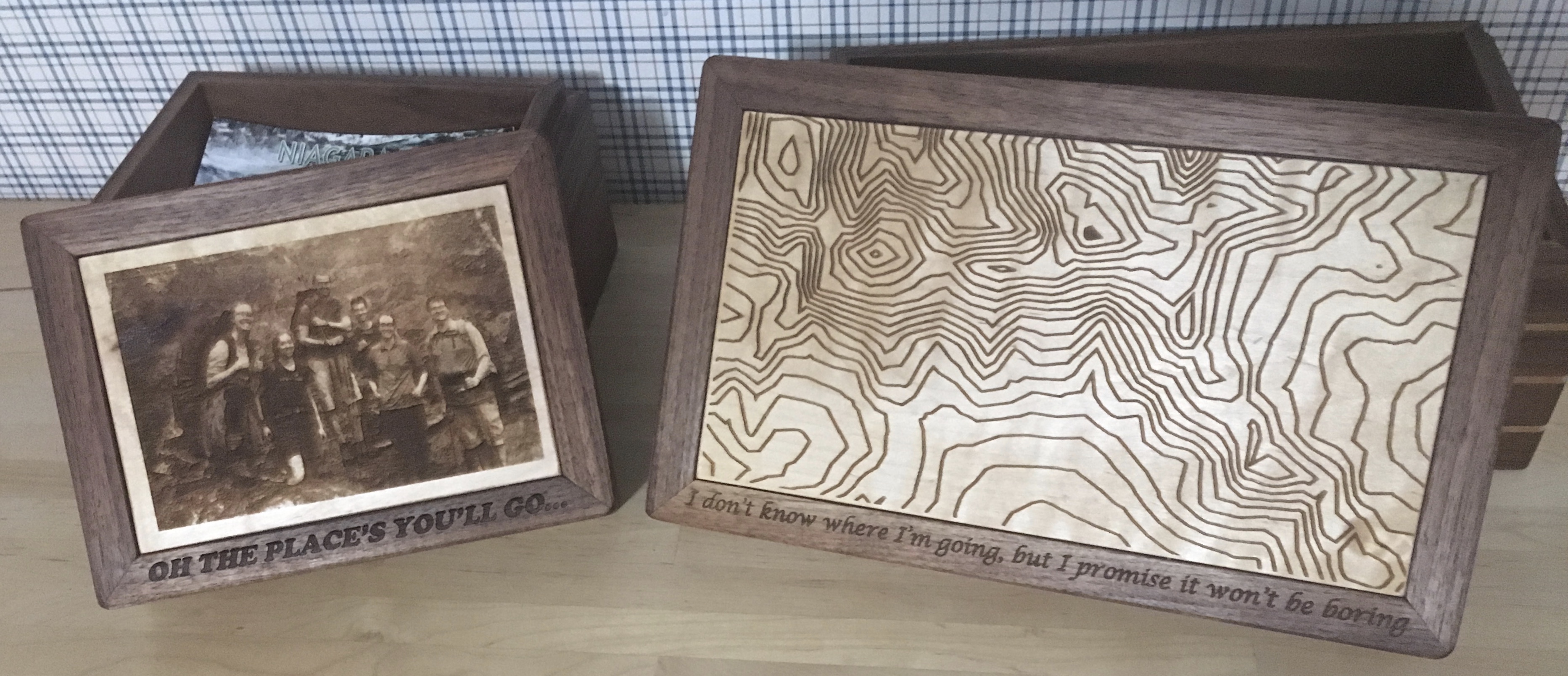 Build: The two boxes measured 11.5x7x5.5″ for the maps and 6x8x5.5″ for the postcards. The sides were made from 0.75″ walnut that was mitered with maple splines. The lids rest on the box with a simple lip cut into both the lid and box. Both were laser engraved using the laser cutter in the on campus maker space. 3 coats of Danish oil were used as a finish. Rendering of the images was done using a MatLab script.